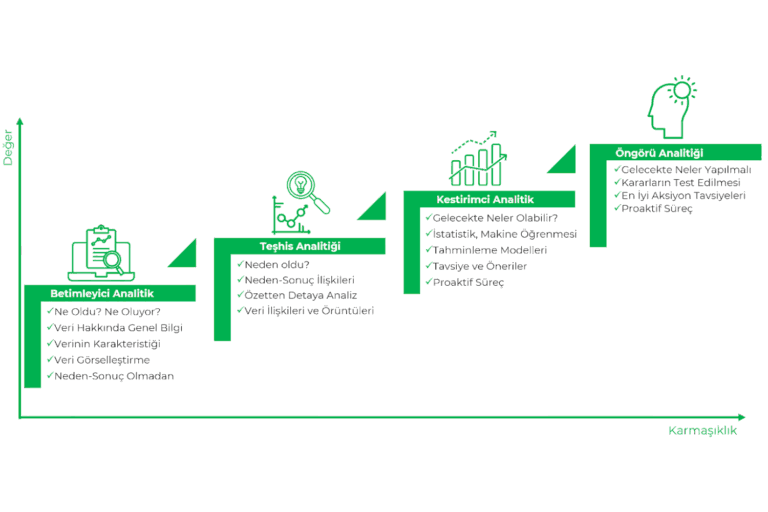 Betimleyici analitik geçmişi gösterir, ama kapsamlı ve stratejik kararlar için öngörü analitiği gerekir. Katmanlar arasında geçiş yapmadan strateji geliştirmek zordur.